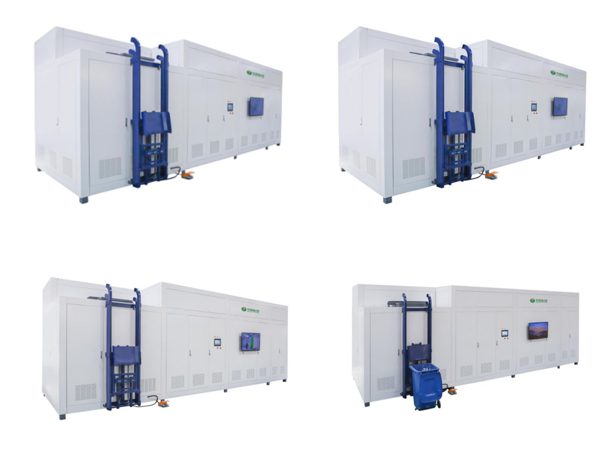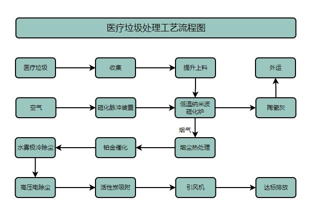首先將垃圾按照本說明書的要求嚴格分類,裝入標準的120L垃圾桶內,按操作流程打開設備所有部件,利用自動投料系統(tǒng)、液壓翻蓋系統(tǒng)和二次隔離倉裝置進行投料。然后將廢紙類垃圾點燃,作為熱源供應。最后等待爐內溫度上升到150~200℃區(qū)間,此時可投入醫(yī)療垃圾。操作人員應根據(jù)屏幕實時監(jiān)測出的爐內溫度進行投料操作,保證爐內物料不間斷的實現(xiàn)低溫碳化降解的處理目的。固體垃圾低溫碳化熱解后的產(chǎn)出物為陶瓷灰,總量大約為投入爐內物料總體積的1%,實現(xiàn)了減量化處理。同時,整個過程確保了爐內溫度低于200℃,從根源上杜絕的二噁英合成所需的環(huán)境條件,所以處理過程不產(chǎn)生二噁英。而在處理過程中產(chǎn)生的少量煙塵經(jīng)過煙氣熱處理系統(tǒng)、鉑金催化裝置、水霧極冷噴淋系統(tǒng)、高壓靜電除塵系統(tǒng)、活性炭吸附系統(tǒng)以多重凈化系統(tǒng)的綜合作用,使得最終排放的尾氣達標排放,實現(xiàn)了無害化處理。